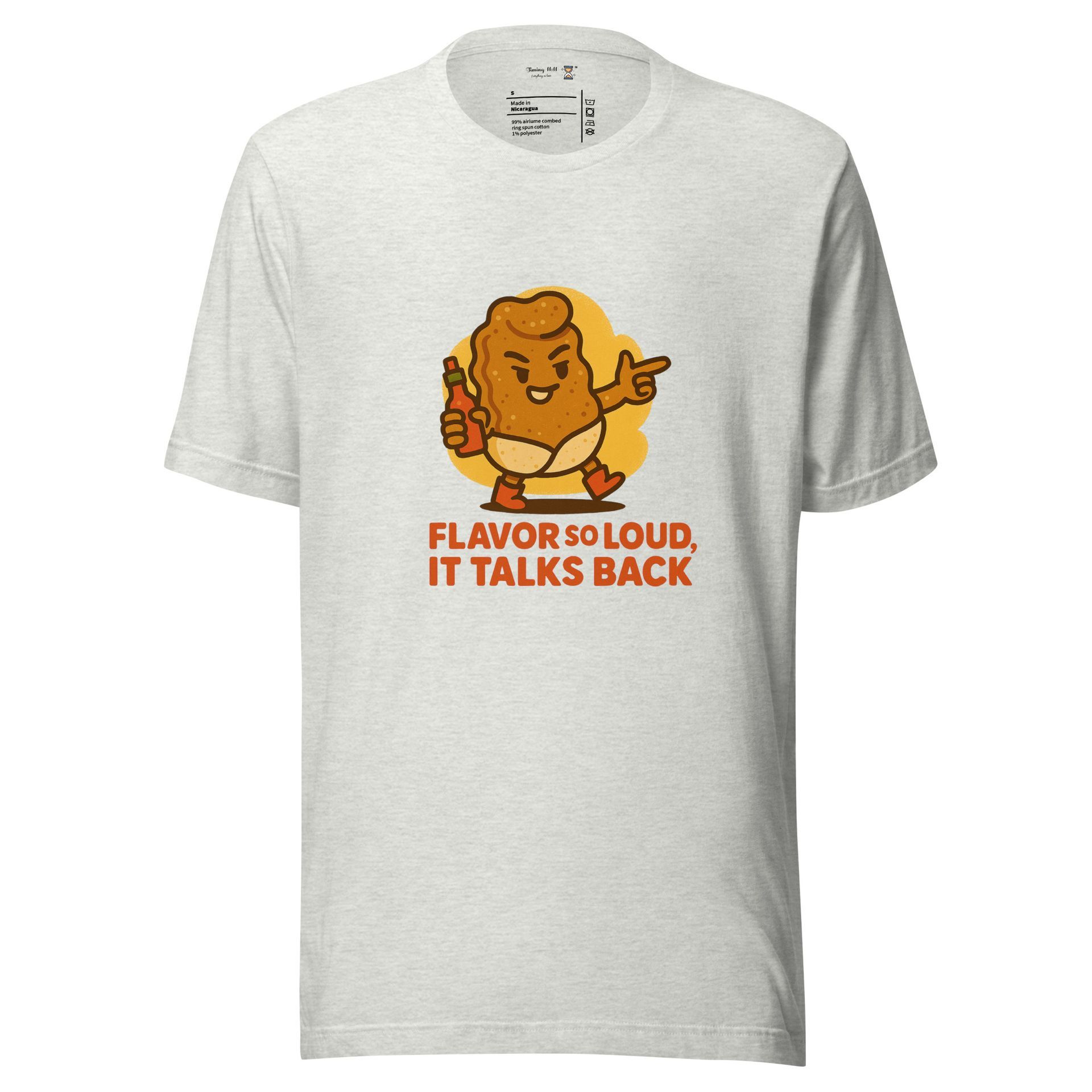 - Front DTG print: Food character with finger guns + bold slogan “FLAVOR SO LOUD, IT TALKS BACK” in warm tones